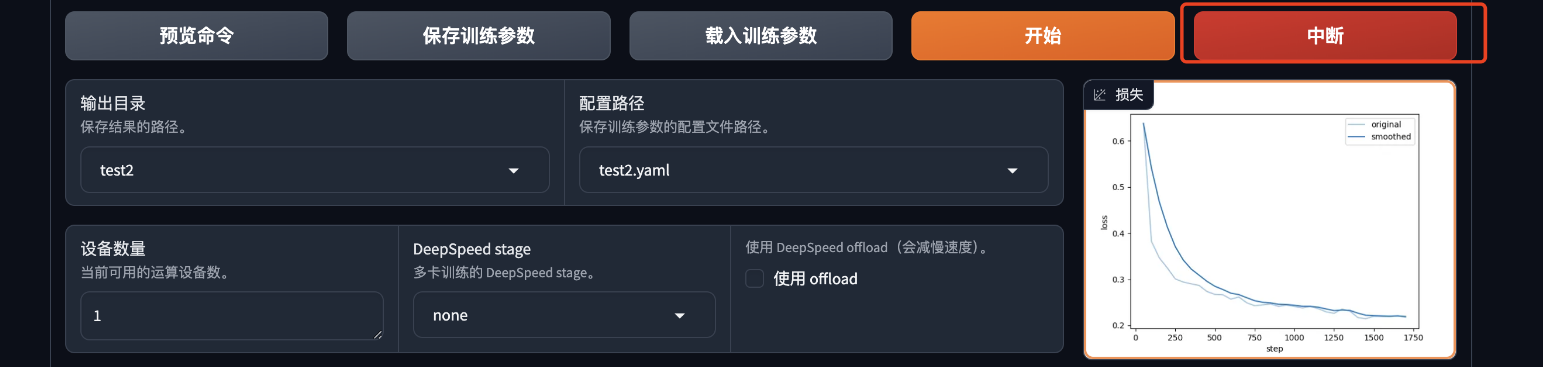 可根据实际需求设置相应的学习率、训练轮数、验证集比例、日志间隔、保存间隔等信息。之后点击预览命令,可查看对应配置的命令行,命令可以本地保存,此后以命令行方式运行也是可行的,点击开始进行训练(需选择基础模型)。命令的具体说明如下(LoRA示例)