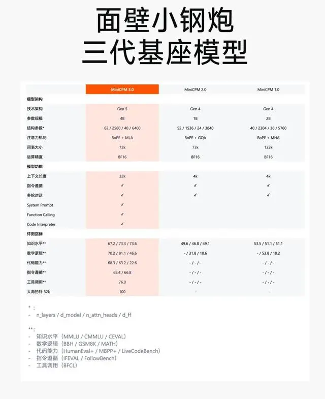MiniCPM3.0基座模型,该模型也是公司旗舰端侧模型面壁小刚炮系列升级版本,据介绍,其以4B为参数,带来超越GPT-3.5的性能,并且,量化后仅2GB内存,对端侧友好,并具有无限长文本的特色。